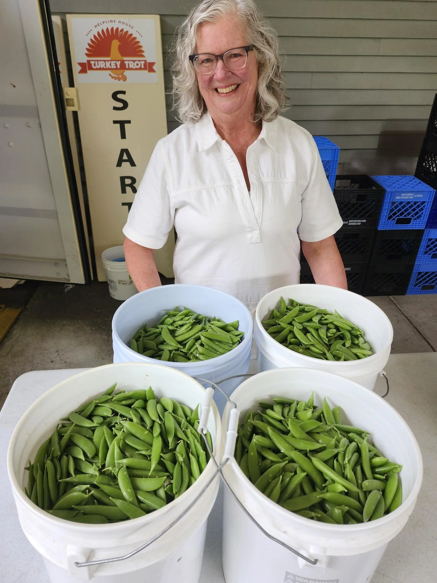Friends of the Farms Executive Director with 73 Pounds of Sugar Snap Peas for the Helpline House Food Bank